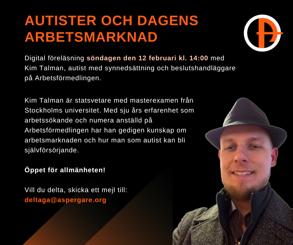 Digital föreläsning: ”Autister och dagens arbetsmarknad” av admin | 8 februari 2023 | Allmänt Digital föreläsning öppen för alla söndagen den 12 februari. Anmäl dig till föreläsningen Förnamn Efternamn E-post Meddelande 6 + 5 = Skicka