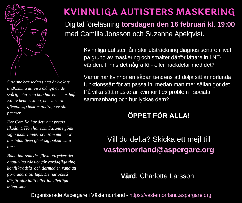 Digital föreläsning: ”Kvinnliga autisters maskering” av admin | 11 februari 2023 | Föreläsningar Digital föreläsning öppen för alla torsdagen den 16 februari. Anmäl dig till föreläsningen Förnamn Efternamn E-post Meddelande Nytt fält Nytt fält Jag vill delta på föreläsningen "Kvinnliga autisters maskering" torsdagen den 16 februari kl. 19:00. 13 + 7 = Skicka