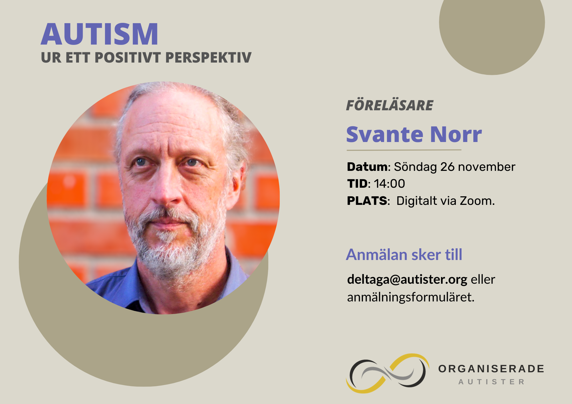 Föreläsning 26/11: ”Autism – Ur ett positivt perspektiv” av admin | 5 november 2023 | Föreläsningar | 1 kommentar Digital föreläsning öppen för alla söndagen den 26 november kl. 14:00. Anmäl dig till föreläsningen ”Autism – Ur ett positivt perspektiv” 26/11 Förnamn Efternamn E-post Meddelande Nytt fält Nytt fält Jag vill delta på föreläsningen "Autism - Ur ett positivt perspektiv" söndagen den 26 november kl. 14:00 via Zoom. 15 + 6 = Skicka 1 kommentar Olafur Stephensen på november 26, 2023 på 12:13 e m Svantes föreläsning