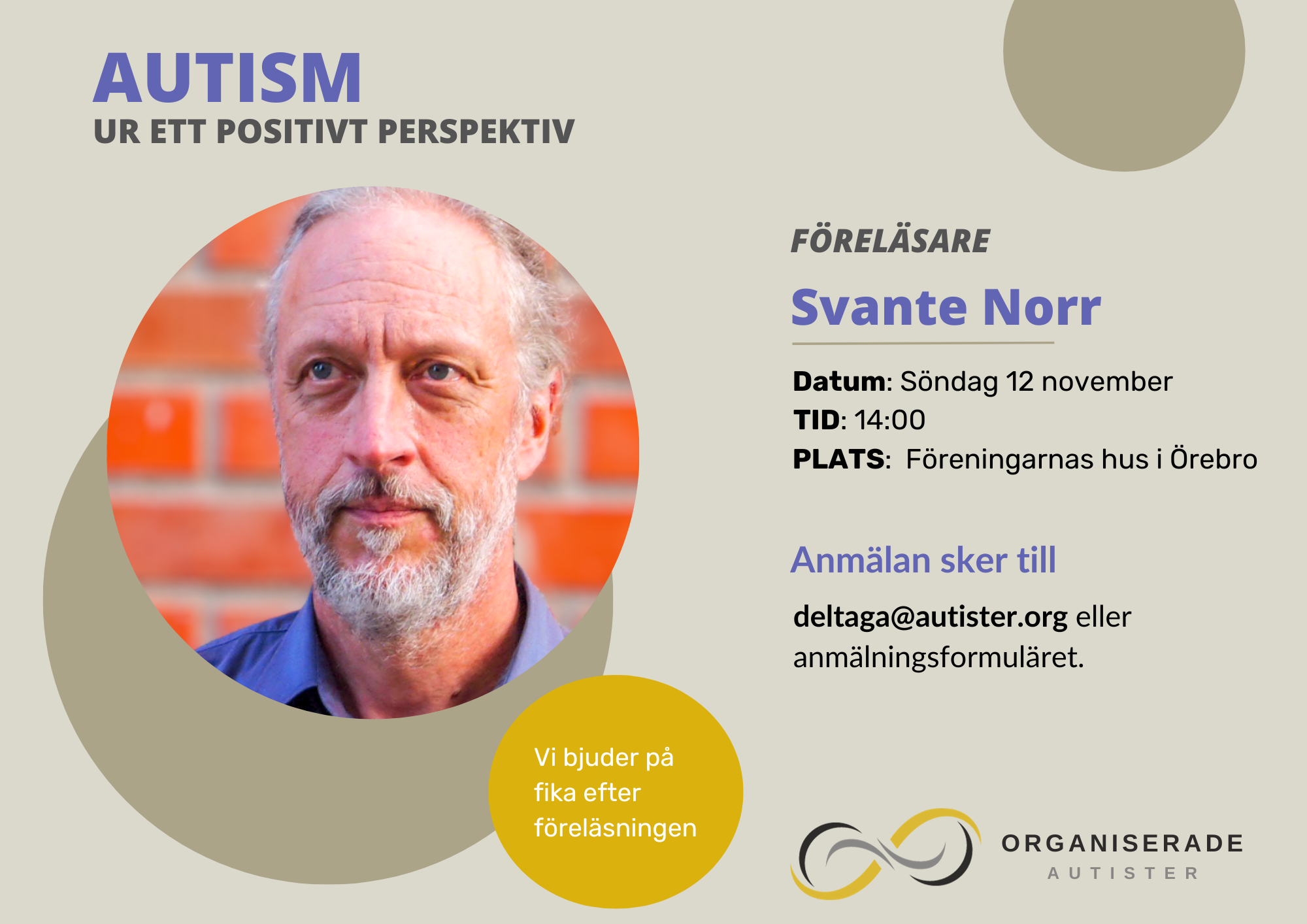 Föreläsning i Örebro 12/11 ”Autism – Ur ett positivt perspektiv” med Svante Norr av admin | 5 november 2023 | Föreläsningar Föreläsning på Föreningarnas hus i Örebro öppen för alla söndagen den 12 november kl. 14:00. Anmäl dig till föreläsningen ”Autism – Ur ett positivt perspektiv” 12/11 Förnamn Efternamn E-post Meddelande Nytt fält Nytt fält Jag vill delta på föreläsningen "Autism - Ur ett positivt perspektiv" söndagen den 12 november kl. 14:00. 15 + 14 = Skicka