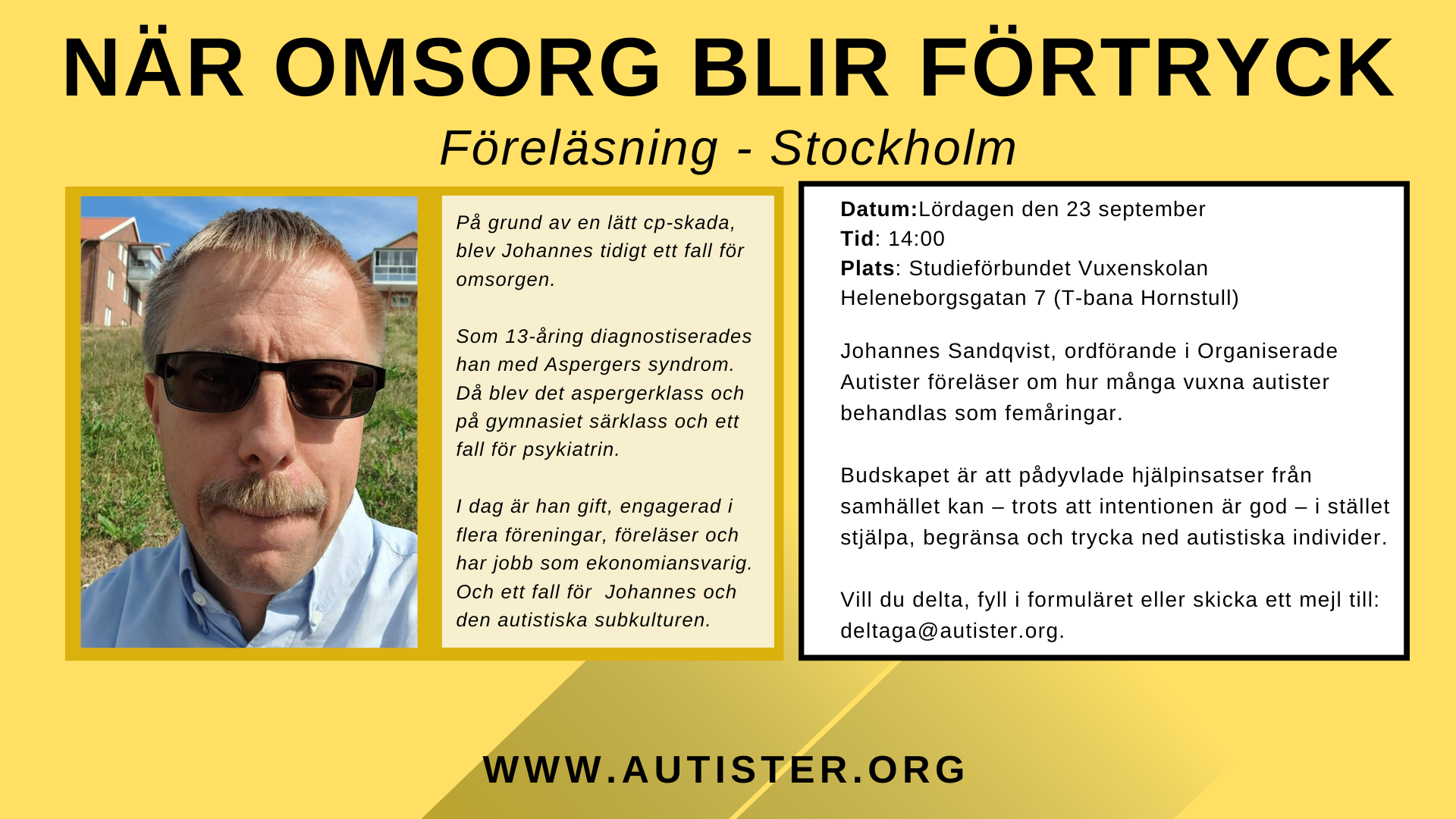 Föreläsning i Stockholm – När omsorg blir förtryck av admin | 12 september 2023 | Föreläsningar Digital föreläsning i Stockholm öppen för alla lördagen den 23 september. Anmäl dig till föreläsningen Förnamn Efternamn E-post Meddelande Nytt fält Nytt fält Jag vill delta på föreläsningen "När omsorg blir förtryck" lördagen den 23 september kl. 14:00. 8 + 2 = Skicka